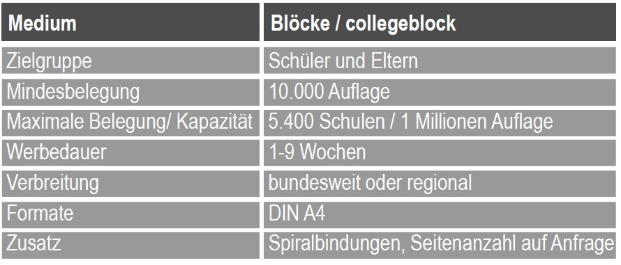 Das Konzept der gesponserten Hefte/ Blöcke in Schulen kommt aus England. Erste werbefinanzierte Schulhefte wurden dann auch 1999 aus Bottrop an deutsche Schulen versendet. Der Kunde kann Werbung auf den Umschlagseiten von Schulblocks mit normaler deutscher Schullineatur buchen. Die Blocks gibt es für für weiterführende Schulen und Berufsschulen. Der Kunde kann neben dem Umschlag auch auf den Innenseiten werben. Die Umschlagseite kann der Kunde relativ frei von Vorgaben gestalten. Das Medium eignet sich auch gut in Kombination mit Samplings. Die Schulblöcke (collegeblocks) als Werbemedium richten sich besonders an die älteren Schüler (SEK 2) die in der Regel auch keine Schulhefte einsetzen. Der Kunde kann auf dem Umschlagseiten als Beilage und auf den Innenseiten werben.